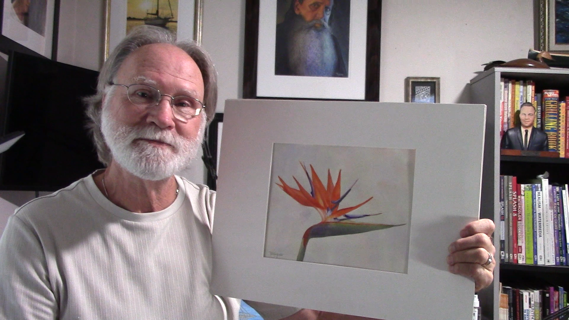 Length 1 hr. 50 min. Follow along as we paint this colorful Bird of Paradise, creating light and shadow on the flower, variated coloring, wet-into-wet and more.