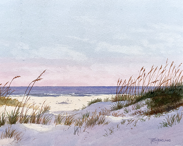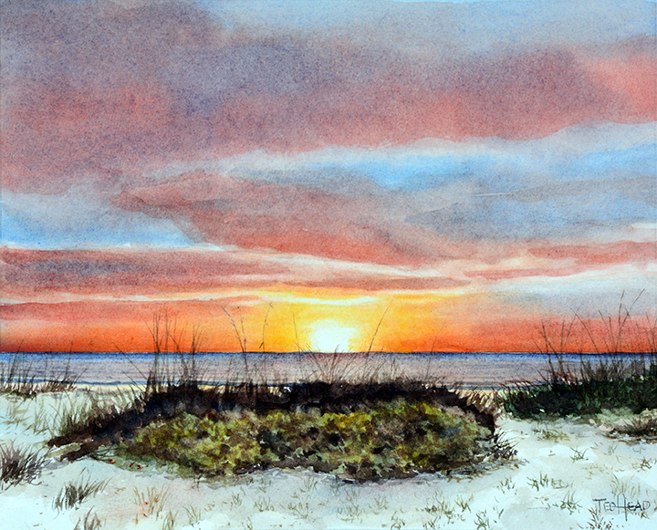 We'll paint this colorful sunrise using wet into wet techniques. The dunes and grasses will utilize negative painting, and we'll mix colorful shadows on the sand.